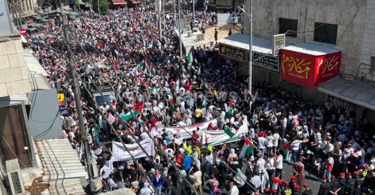 شارك عشرات آلاف الأردنيين في المسيرة الجماهيرية الحاشدة التي انطلقت بعد صلاة ظهر الجمعة من أمام المسجد الحسيني تحت شعار "الطوفان الشعبي"، نصرة للمقاومة الفلسطينية ودعما للأهل في قطاع غزة الذين يتعرضون