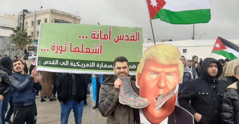اعتصم العشرات أمام السفارة الأمريكية في عمان بالتزامن مع إعلان الرئيس الأمريكي دونالد ترامب ورئيس وزراء الاحتلال بنيامين نتنياهو خطة السلام في الشرق الأوسط المعروفة باسم "صفقة القرن". وهتف المحتجون،