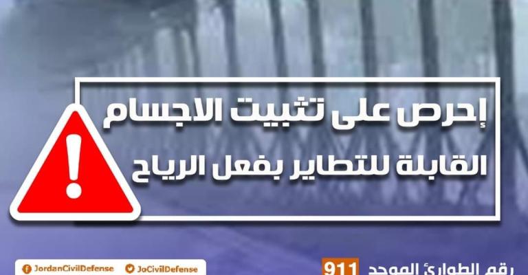 الامن العام : مناطق المملكة تشهد هبوب رياح شديدة ، نهيب بالجميع تثبيت الاجسام المتطايرة سواء على المباني او مركبات الشحن . ** تم التعامل مع حادثة لتطاير الواح زجاجية من مبنى قيد الانشاء في منطقة ماركا