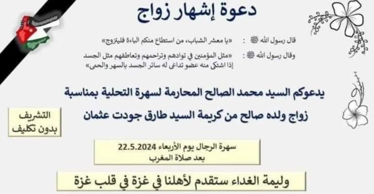 أشهر مواطن أردني عن حفل زفاف ابنه في منطقة سحاب جنوبي عمان، من خلال إقامته وليمة غداء في قطاع غزة بدلا من إقامتها في الأردن، وذلك دعما وتضامنا مع الشعب الفلسطيني. وأشاد العديد من المعلقين على الخبر