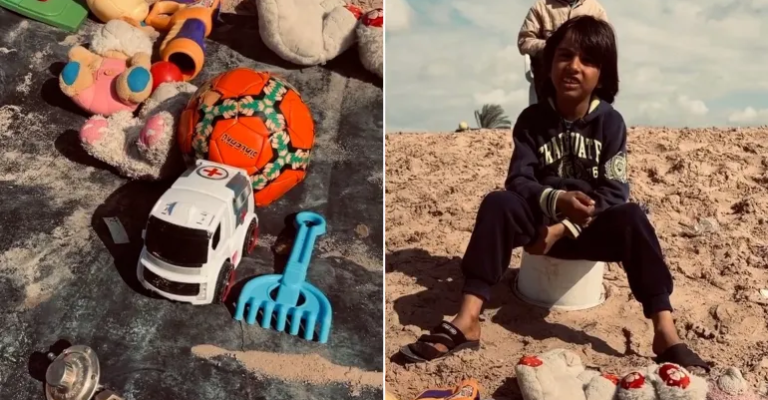 أظهر مقطع فيديو انتشر على شبكات التواصل الاجتماعي مؤخرا، الطفل الفلسطيني نور الدين وهو يجلس في أحد شوارع غزة ويعرض ألعابه للبيع بعد تهجيره من منزله وعدم إيجاده لمكان يلعب فيه بسبب الدمار الذي خلفته