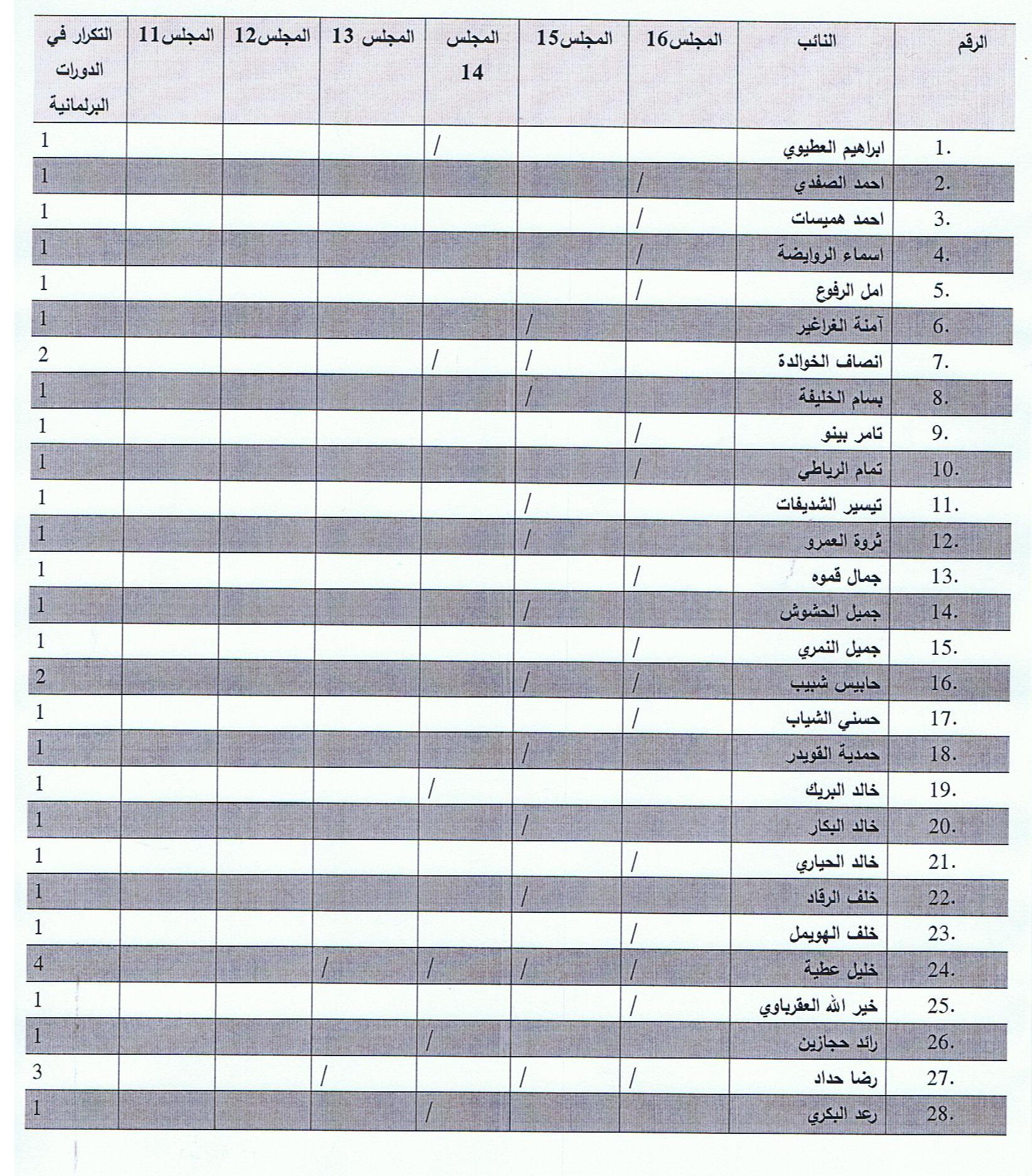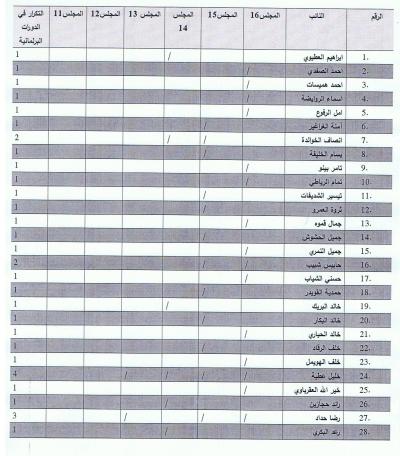 ويبين التقرير وجود النائب الأسبق عبد الكريم الدغمي في جميع المجالس النيابية منذ المجلس الحادي عشر في عام 1989 ولغاية المجلس السادس عشر 2012، بينما تواجد النائب السابق سعد هايل السرور في جميع المجالس النيابية باستثناء المجلس السادس عشر.