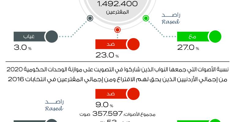 43.3%من النواب الحاضرين رفضوا إقرار الموازنة العامة لعام 2020 11نائب تغيبوا عند وقت التصويت على قانون الموازنة العامة بمجمله. جميع نواب دائرتي اربد الأولى ومعان صوتوا مع إقرار الموازنة العامة. نواب