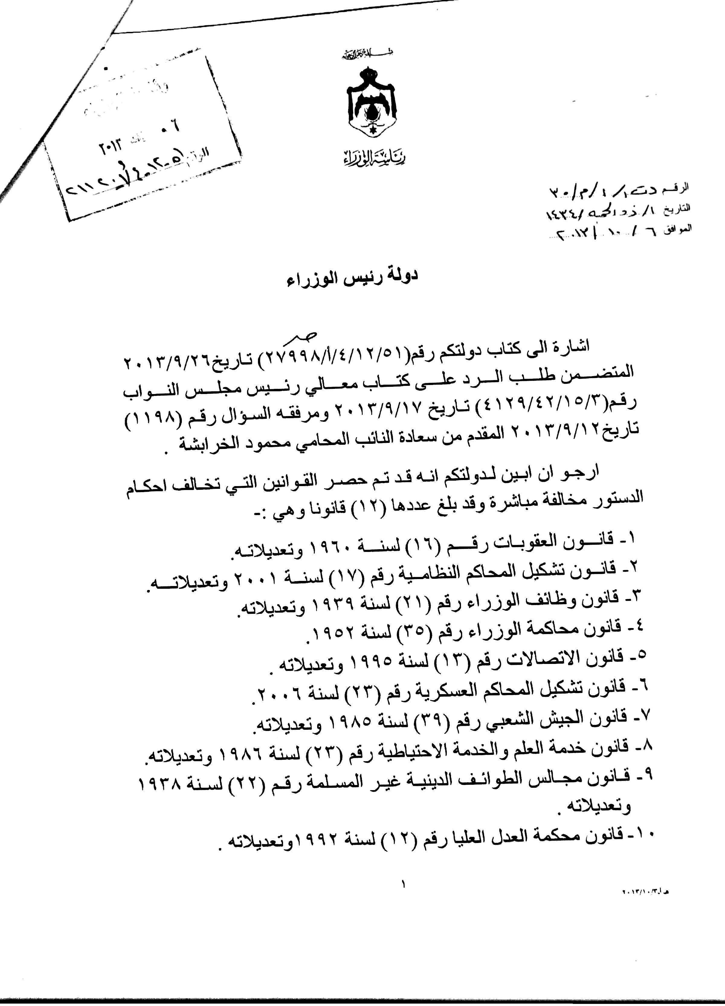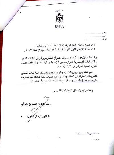 ووفقاً لجواب الحكومة آنذاك، فقد أوضحت في جوابها "أن هذه القوانين قيد الإعداد من قبل ديوان التشريع والرأي لغايات السير بالإجراءات الدستورية لإقرارها من قبل مجلس الأمة قبل ابتداء الدورة العادية للمجلس في 3/11/2013".