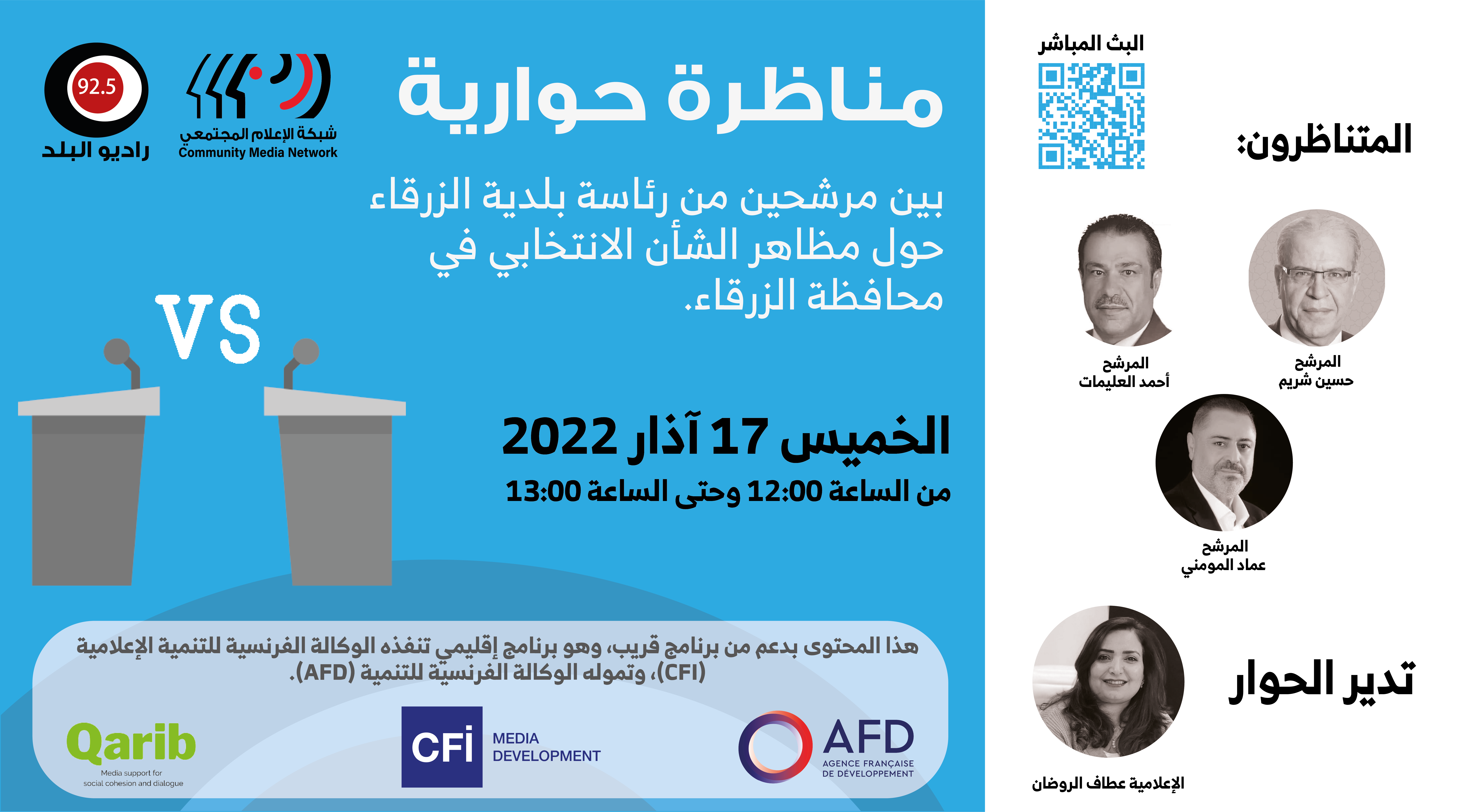 مناظرة حوارية بين مرشحين من رئاسة بلدية الزرقاء حول مظاهر الشأن الانتخابي في محافظة الزرقاء. وذلك من الساعة 12:00 وحتى 1:00 من ظهر اليوم.