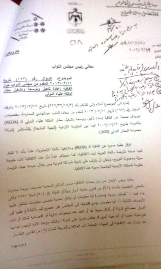 هذا وصنفت الحكومة إتفاقية إعادة تأهيل مطار الملكة علياء الدولي الـ (REOA) ضمن الوثائق السرية جدا والمحمية استنادا لقانون حماية أسرار وثائق الدولة رقم 50 لسنة 1971.