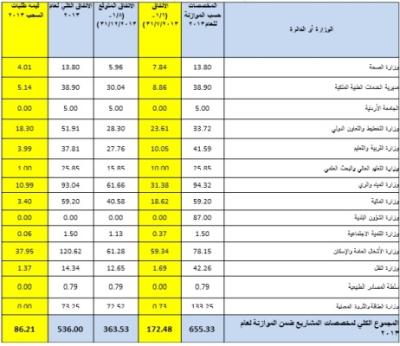 المجموع الكلي لمخصصات المشاريع ضمن الموازنة لعام 2013 | 655.33 | 172.48 | 363.53 | 536.00 | 86.21 |