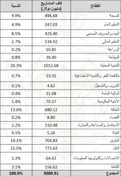 فيما بلغ حجم المشاريع التي تم توقيع اتفاقيات لتمويلها، وفقا لأرقام وزارة التخطيط، حوالي (2619) مليون دولار، تسعة اتفاقيات لتمويل مشاريع بقيمة (1170) مليون دولار من المنحة الكويتية وسبعة اتفاقيات لتمويل مشاريع بقيمة (666) مليون دولار من المنحة السعودية إضافة إلى مذكرة تفاهم لتمويل مشاريع المنحة الإماراتية، وقد تمت الموافقة على محضر اجتماعات اللجنة الفنية والمتضمن تمويل مشاريع بقيمة (783) مليون دولار.