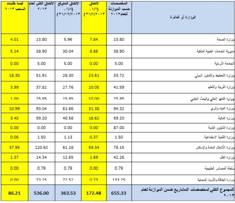 الوزارة أو الدائرة | المخصصات حسب الموازنة للعام 2013 | الانفاق | الانفاق المتوقع (1/8- 31/12/2013) | الانفاق الكلي لعام 2013 | قيمة طلبات السحب 2013 |