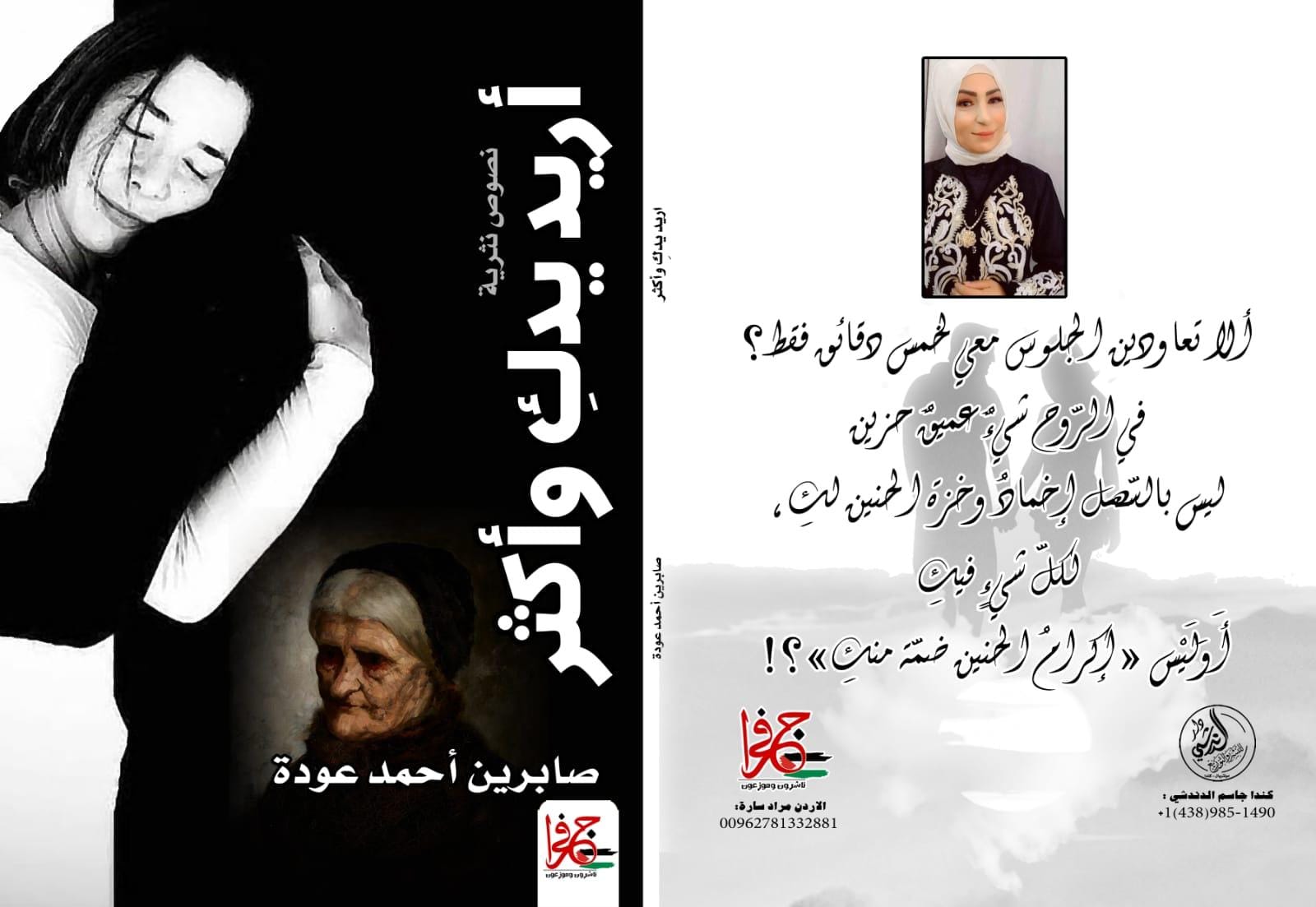 للمرة الثانية يتاح لي قراءة كتاب للكاتبة صابرين أحمد عودة فكان الأول رواية والآن كتاب من نصوص نثيرة أو ما اصطلح عليه بالشعر النثري تحت مسمى "أريدكَ وأكثر"، والكتاب من 182 صفحة من القطع المتوسط من اصدار جفرا ناشرون وموزعون مع لوحة غلاف تثير التساؤل حول محتوى الكتاب مسبقا ولوحة غلاف تحمل صورة الكاتبة بشكل جانبي لا يظهر وجهها وهي ترتدي الثوب الفلسطيني والطرحة البيضاء على رأسها تنظر مبتسمة بالمرآة التي تعكس وجهها مع جمال الاشجار من حولها وهي مبتسمة، وعبارات من نص يتحدث عن الحب من نص بالكتاب تبدأه بالقول: "لا تكتمل الأنثى، إلّا مع رجل يدرك كيفية، الوصول لقلبها" وتنهيه بالقول بصيغة التحذير:"إيّاك ثمّ إيّاك محاورة أنثى لا تدرك، نوتة الحبّ وهمساته"، فهل كان العنوان للكتاب "أريدكَ وأكثر" يخاطب هذا الآخر؟ وهل أرادت أن تعطينا بابتسامتها على الغلاف انطباع أنها راضية عما كتبت من السطر الأول حتى الأخير أو مبتسمة لأرواح والدها ووالدتها؟، وكان الاهداء خارج عن الأسلوب التقليدي فجاء على شكل نثيرة تتحدث عن أولادها وأمها التي رحلت قبل ثلاثة سنوات، وتبدأ القول بعبارة مؤلمة "لا أب لي" فالأب رحل من ثلاثة عقود، وفي صفحة لاحقة تقول: "عذرًا: من تحيّا بالطهر لا تكفّ روحها عن قصائدكَ، وترتحل!"، لتقول في الصفحة التالية وتحت عنوان "تنويه" وقبل أن تبدأ نصوص الكتاب: "من يحبّ كاتبة عليه التعمق في حنايا روحها، يعتزلها مدة زمنية لتدوّن ما يجول بخاطرها أثر موقف مرّ أمامها لتخرج منتعشة، التلذذ في وقت القهوة المتكرر، مع عدم نسيان الغزل الصّريح في حرفها وأنوثتها الطاغية، تحمل مزاجيتها وتقلباتها الخريفيّة"، فهل كل هذه البدايات موجهة لمن تريده وأكثر؟ فما قرأته يشير لرغبة عارمة تجاه المخاطب فهي لا تريده فقط.. بل أكثر، والأكثر يبقى في قلب الشاعرة إن لم نكتشفه خلال الكتاب.