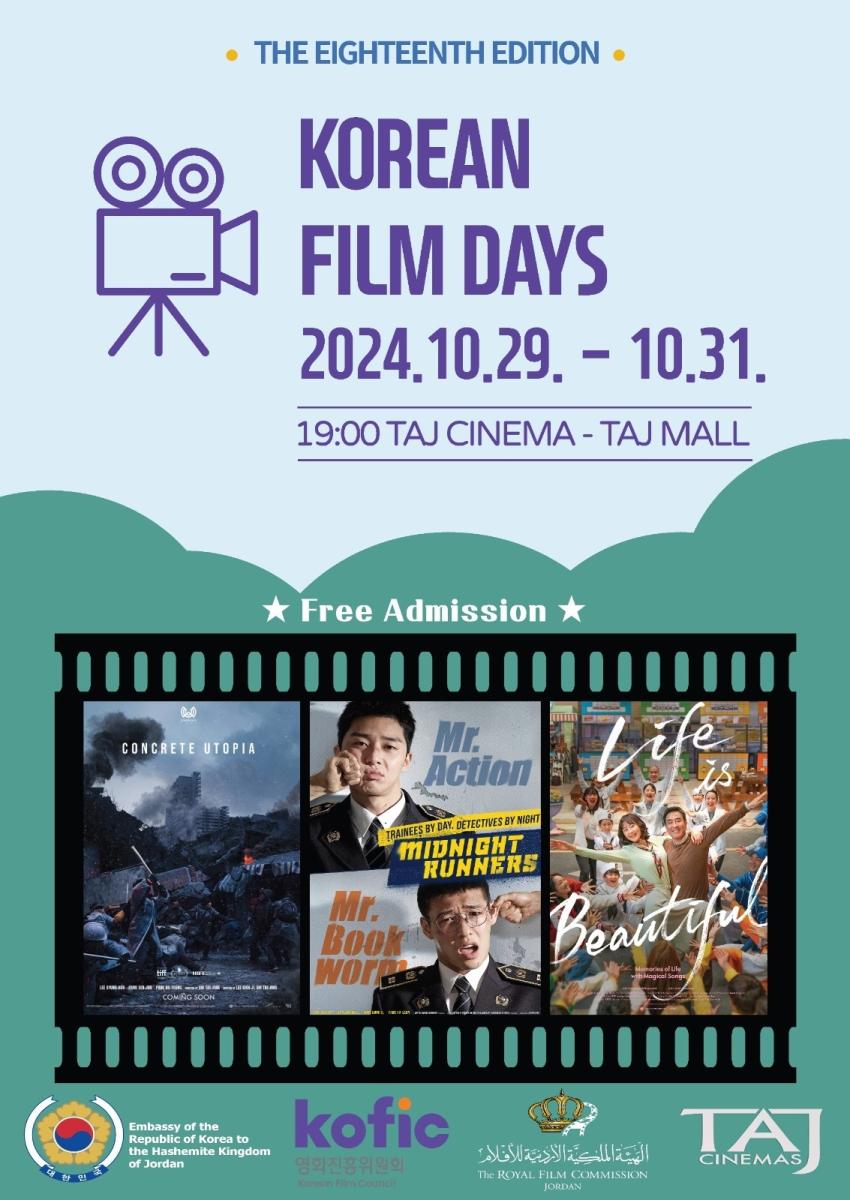 انطلقت مساء أمس الثلاثاء في سينما تاج مول، عروض الدورة الثامنة عشرة من "أيام الفيلم الكوري"، والتي تنظمها الهيئة الملكية الأردنية للأفلام، بالتعاون مع سفارة جمهورية كوريا في المملكة.