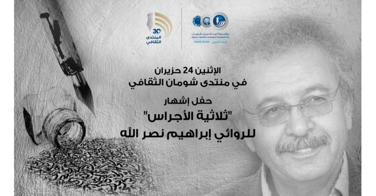 يستضيف منتدى عبد الحميد شومان الثقافي، في السادسة والنصف، يوم غد الإثنين 24 حزيران (يونيو) حفل إشهار "ثلاثية الأجراس" للروائي إبراهيم نصر الله. ويتحدث في حفل الإشهار كل من د. جمال مقابلة ود. رزان