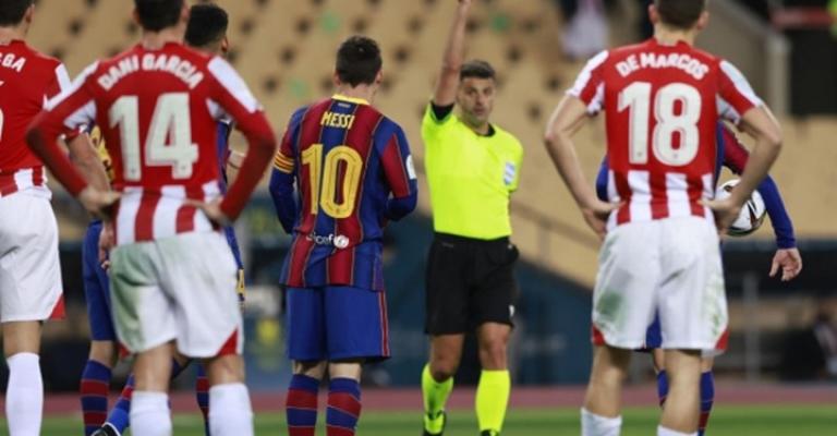 تلقى النجم الأرجنتيني ليونيل ميسي لاعب فريق برشلونة لكرة القدم، البطاقة الحمراء خلال المباراة النهائية لكأس السوبر الإسباني لموسم 2020-2021، التي خسرها النادي الكتالوني أمام أتلتيك بيلباو على ملعب "لا