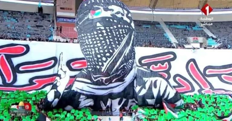 اكتست مدرجات ملعب "رادس" في ضواحي تونس بأعلام فلسطين واليافطات المؤيدة لها خلال المباراة التي فاز بها الأفريقي على الأولمبي الباجي 3-1 في الدوري التونسي لكرة القدم. وخطف "التيفو" أو اللوحة التي رفعتها