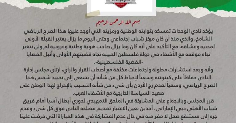 حسم نادي الوحدات أمر المشاركة في مباراة ملحق دوري أندية أبطال آسيا لكرة القدم والتي تجمعه بنظيره شباب الأهلي الإماراتي يوم ١٥ اب / أغسطس الجاري على ملعب ال راشد في مدينة دبي. وكانت إدارة الوحدات قد