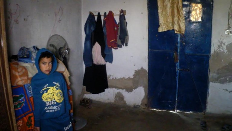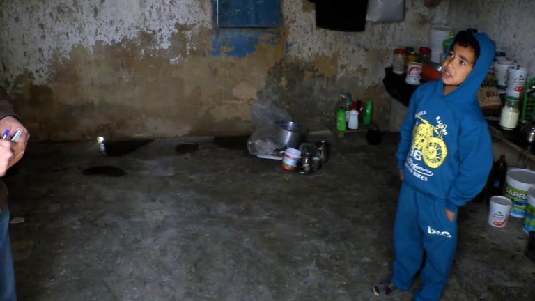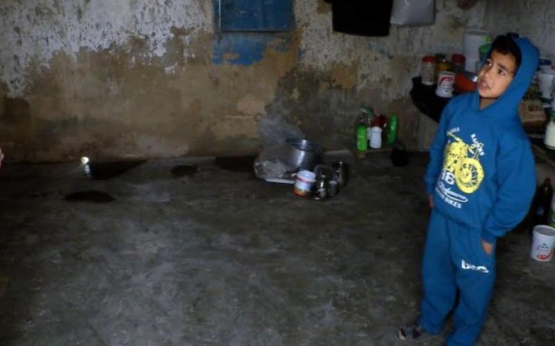 تنام أم عمر وطفلاها على فراش لا يقي برد الأرضية الرطب، بسبب تسرب المياه من السقف، وشقوق الجدران، لتضطر إلى الصعود لسطح المنزل لجرف المياه عنه، كي لا تغرق الغرفة.