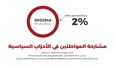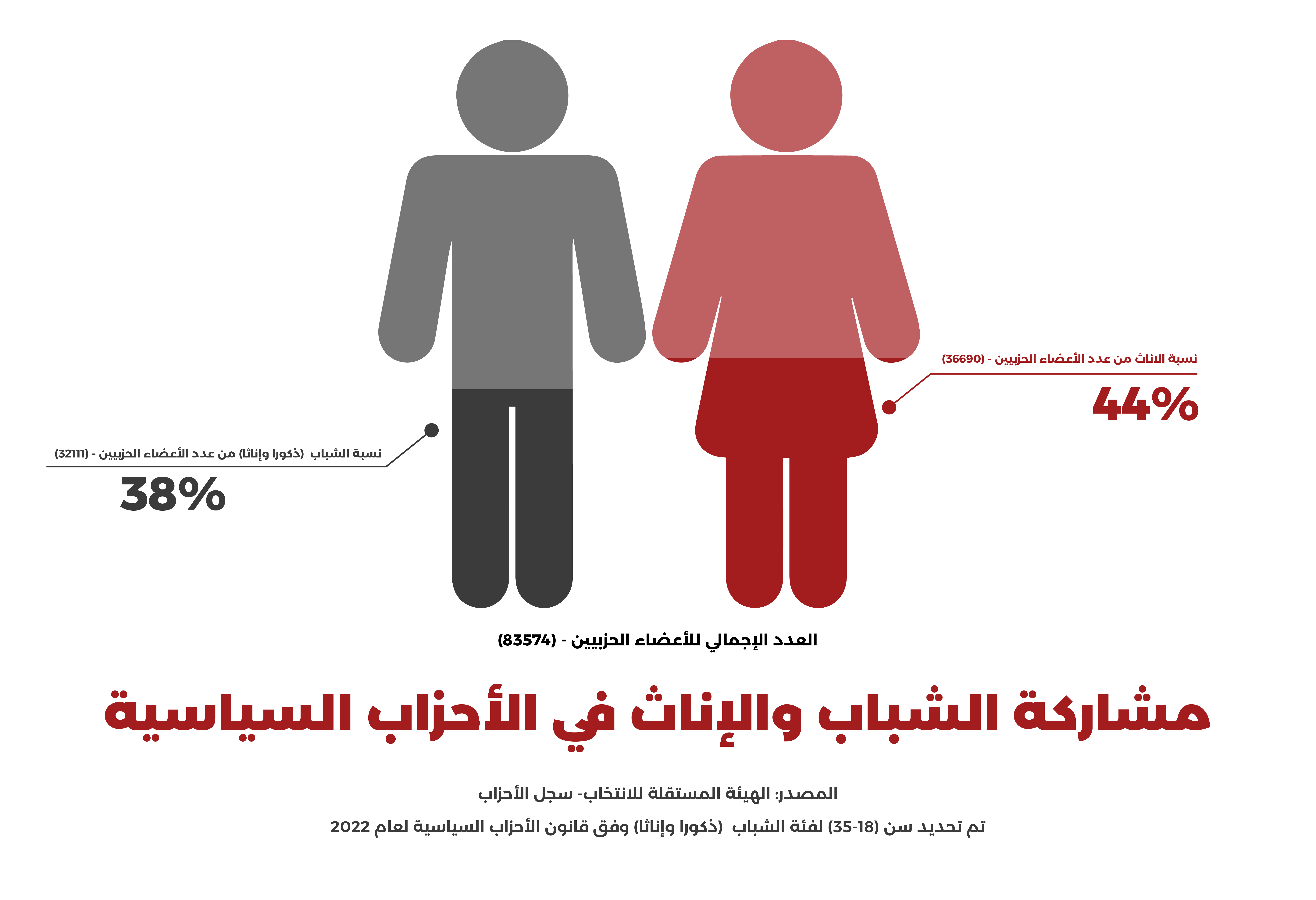 وتظهر تلك الأرقام بأن نسبة الشباب من عدد أعضاء الأحزاب السياسية وفق موقع الهيئة المستقلة للانتخاب، هي 38% من مجموع أعضاء الأحزاب، بينما تبلغ نسبة مشاركة المرأة في الأحزاب ما يقارب 44%.