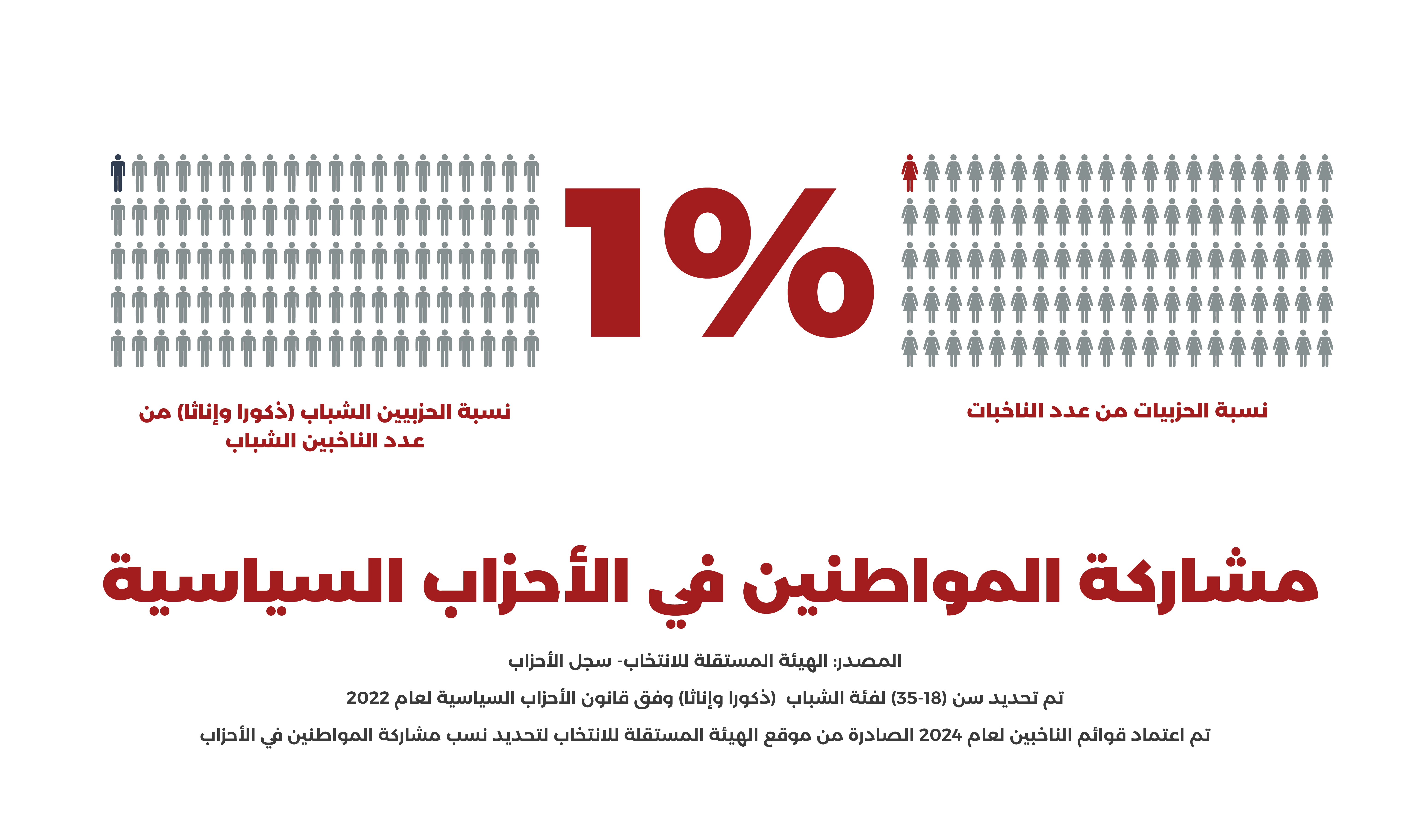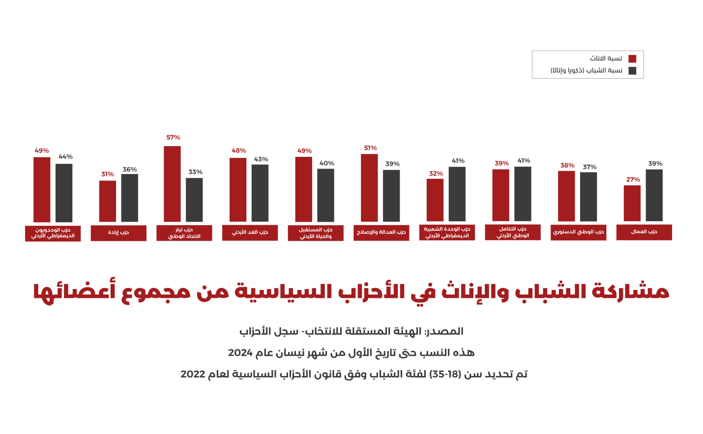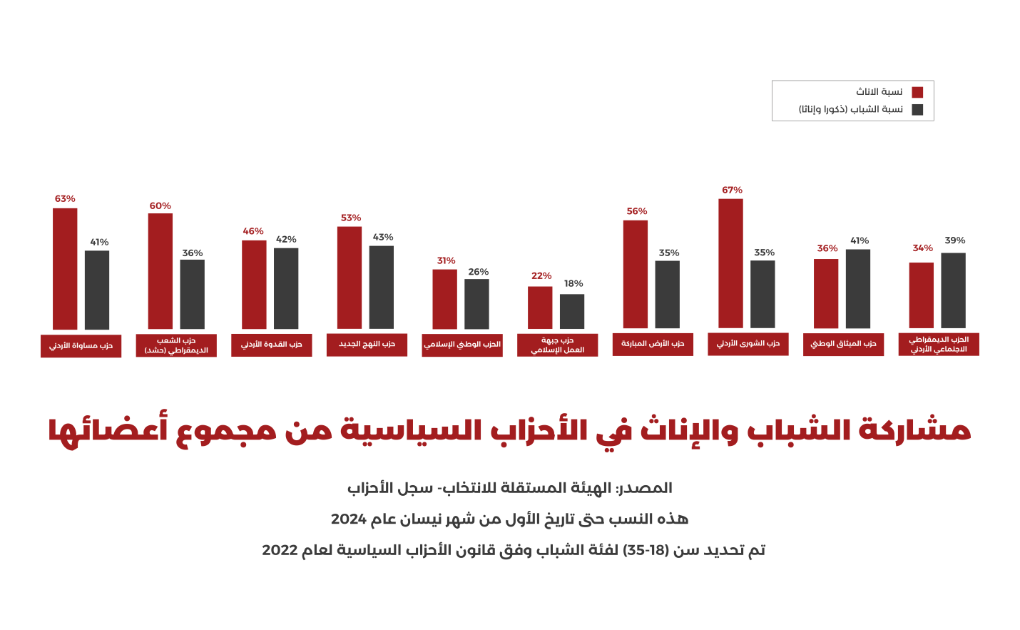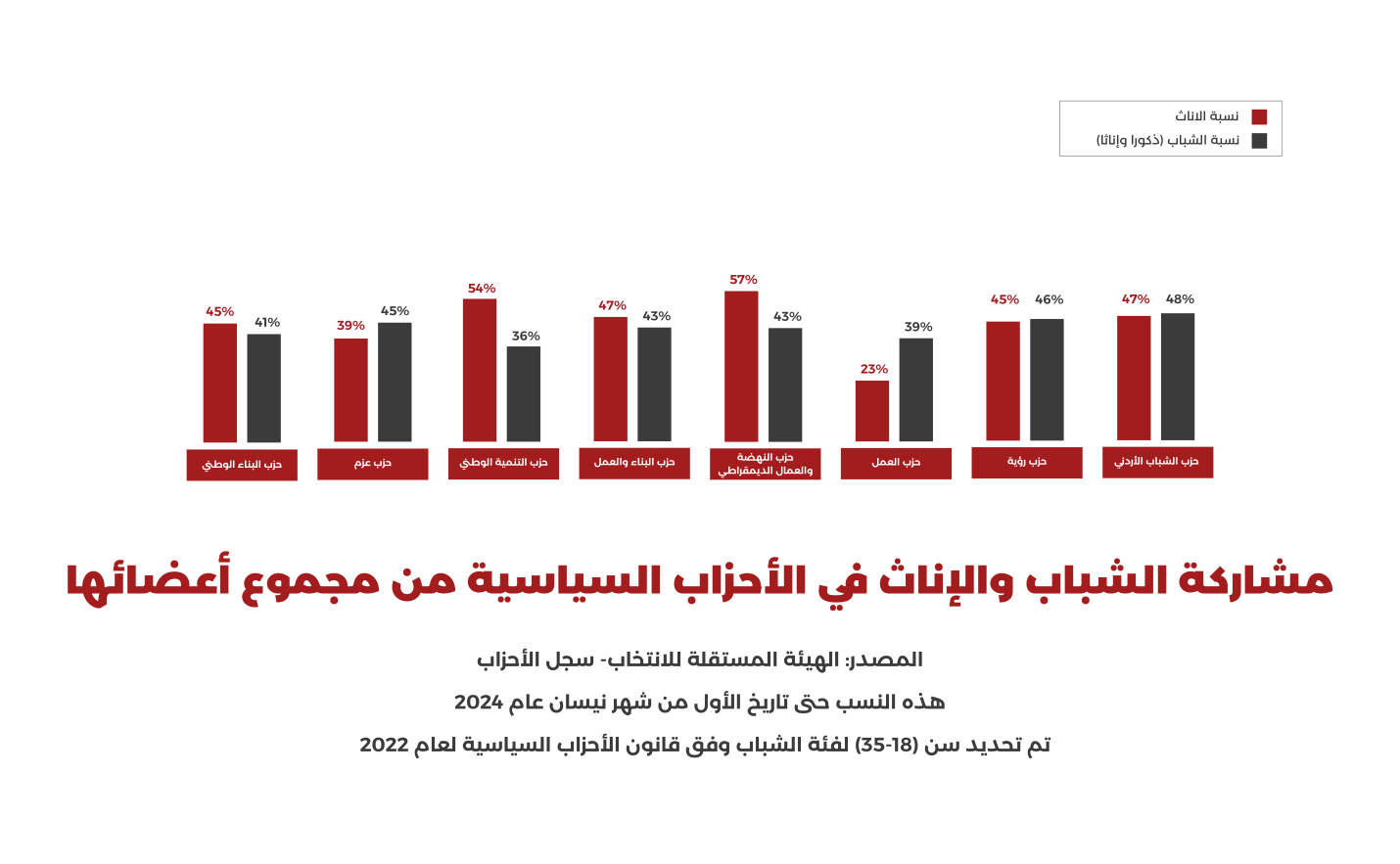 ولتحديد نسبة مشاركة الشباب والمرأة من المجتمع الأردني بالكامل، تم اعتماد قوائم الناخبين لعام 2024 الصادرة عن الهيئة المستقلة للانتخاب؛ حيث بلغ عدد الناخبين 5052946، كان عدد الشباب منهم، ما يقارب 2322957 ناخب وناخبة شباب، أي أن نسبة الشباب الأردني المشارك في الأحزاب تبلغ ما يقارب 1% فقط، بينما تبلغ نسبة مشاركة المواطنين في الأحزاب استنادا لقوائم الناخبين لعام 2024 ما يقارب 2%.