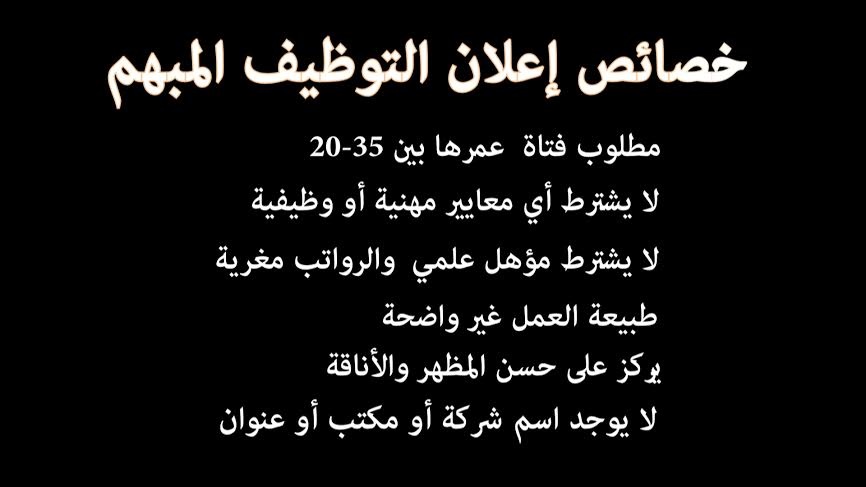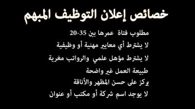 تتفق المختصة في الشأن الإعلامي، سوسن زايدة، وعميد كلية الإعلام في جامعة الشرق الأوسط د. كامل أخو أرشيدة مع تعريفنا لإعلان التوظيف "المبهم"، مُوَضّحين أنها ليست إعلانات توظيف محترمة، بقدر ما تُسلّع المرأة، كونها تبحث عن مواصفات جمالية لشكلها ومظهرها، دون التطرق إلى مهاراتها وشهاداتها وخبراتها، علاوة على أنها تثير الشكوك بنسبة عالية؛ خاصة أن المعلن فيها مجهول.