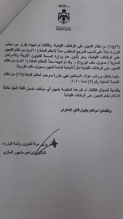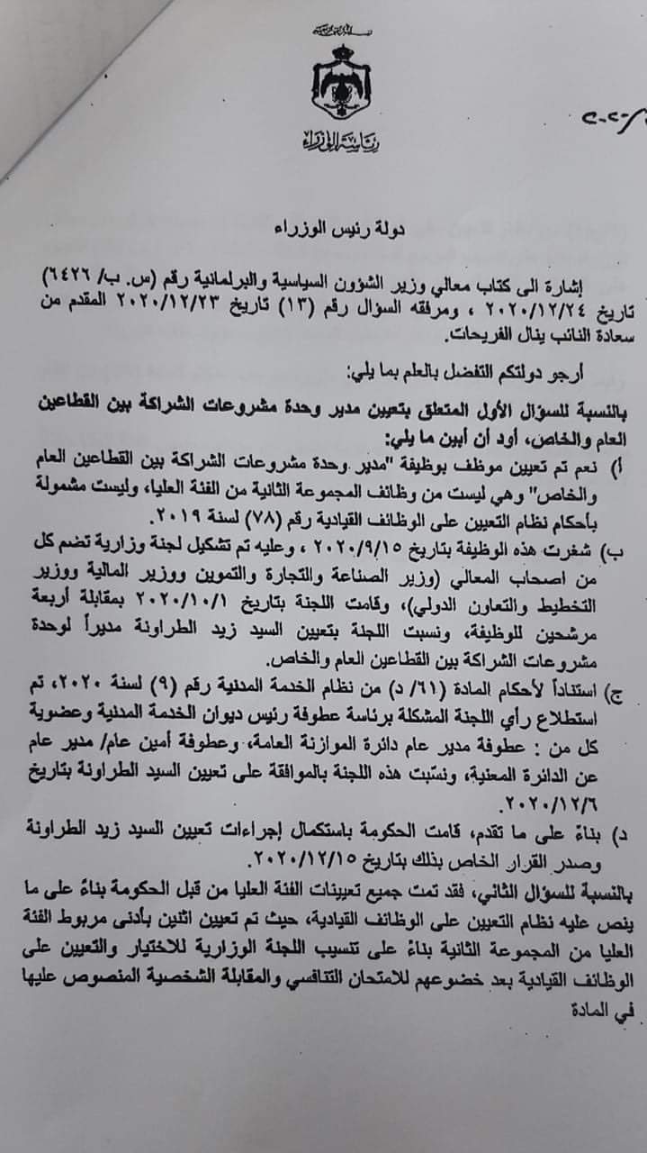 وأضاف أن الوظيفة شغرت بتاريخ 15-9-2020، وعليه تم تشكيل لجنة وزارية تضم وزراء الصناعة والتجارة والمالية والتخطيط، قابلت 4 مرشحين للوظيفة، ونسبت بتعيين زيد الطراونة.