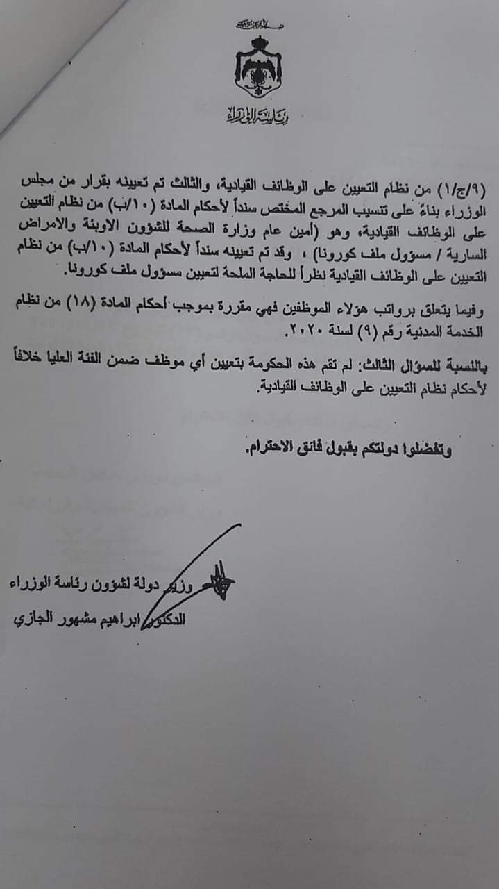 وقال وزير الدولة لشؤون رئاسة الوزراء إبراهيم مشهور الجازي، اليوم الأربعاء، إن هذه الوظيفة ليست من المجموعة الثانية من الفئة العليا، وليست مشمولة بأحكام نظام التعيين على الوظائف القيادية رقم (78) لسنة 2019.