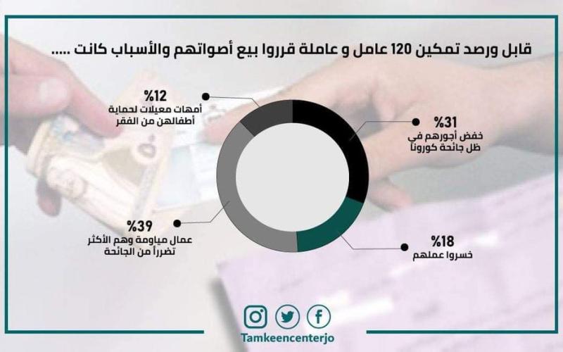 وقال التقرير الذي انتهى فريق "تمكين" من اعداده عشية اجراء الانتخابات أن 31 % ممن قرروا بيع أصواتهم الانتخابية عزوا ذلك إلى خفض أجورهم في ظل جائحة كورونا، و18% منهم قرر بيعها بسبب خسارتهم عملهم، فيما كان 39% ممن قرروا بيع أصواتهم من عمال المياومة التي تعتبر من الفئات الأكثر تضررا من الحظر الذي فرضته الحكومة بعد الانتخابات لمدة أربعة أيام، كما شكلت الأمهات العاملات المعيلات 12% من نسبة من قرروا بيع أصواتهم الانتخابية.