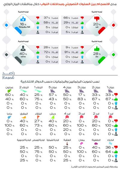 وذكر الدكتور عامر بني عامر مدير عام مركز الحياة – راصد أن أعضاء الكتل النيابية لم ينسجموا في سلوكهم التصويتي وهذا يؤشر إلى عدم تماسك الكتل النيابية، ويؤكد ضرورة العمل على تطوير العمل الكتلوي في مجلس النواب، فيما بين بني عامر أن أعلى الكتل انسجاماً بسلوكها التصويتي هي كتلة القرار حيث منح الثقة ما نسبته 86% من مجموع أعضاءها، تلتها كتلة العدالة حيث منح الثقة ما نسبته 85% من أعضائها، وكانت أعلى الكتل النيابية حجباً للثقة هي كتلة الشعب حيث حجب ما نسبته 50% من مجموع أعضائها الثقة عن الحكومة.