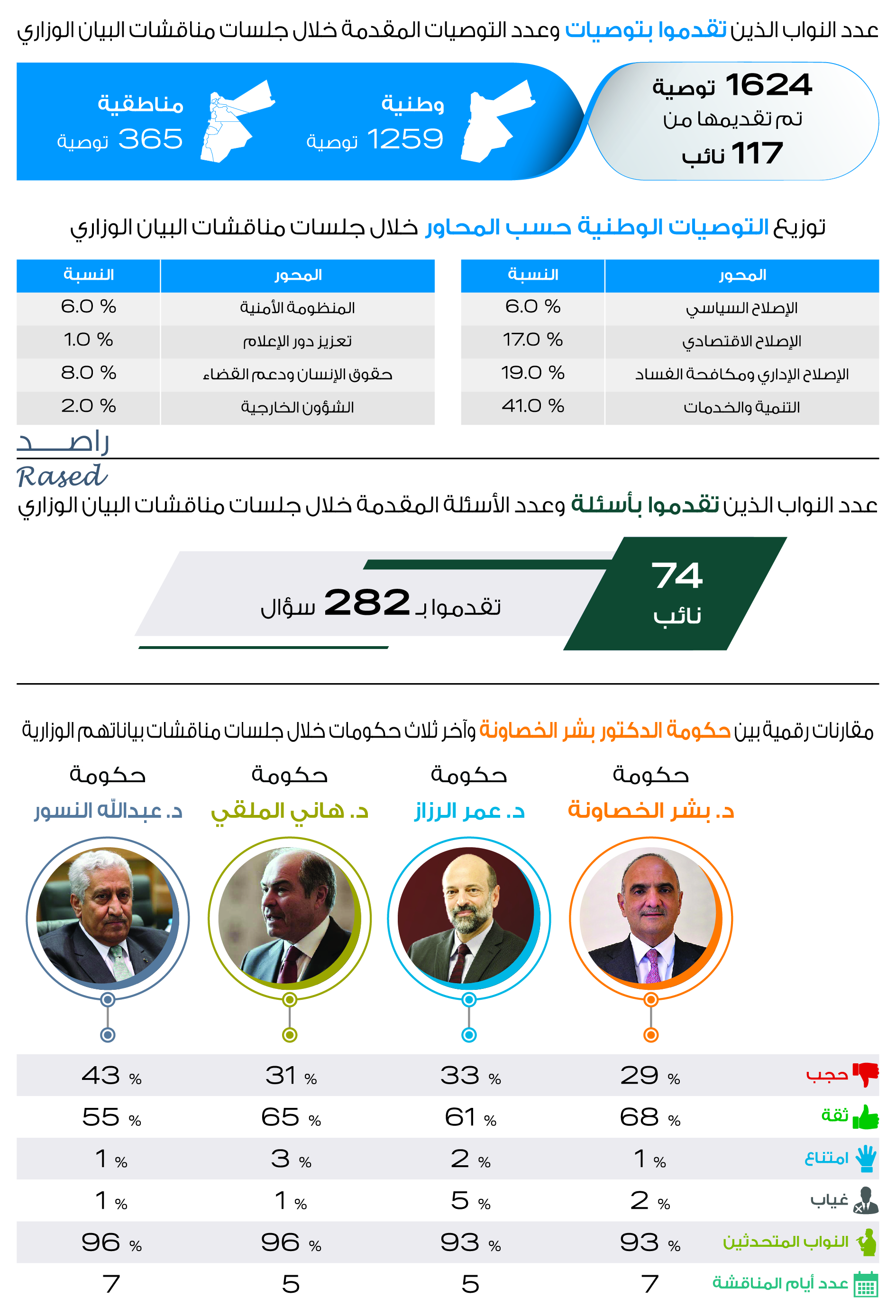 وقدم 74 برلمانياً وبرلمانية أسئلة للحكومة خلال خطاباتهم بالرد على البيان الوزاري حيث بلغ مجموع الأسئلة المقدمة 282 سؤالاً، كما تحدث 58% من البرلمانيين والبرلمانيات حول قضية المعلمين مطالبين ضرورة فتح باب الحوار وتعزيز دور المعلم وتقديم كل ما يلزم لإعادة هيبة التعليم، ولوحظ خلال خطابات مجلس النواب أن 16 برلمانياً وبرلمانية تحدثوا حول ضرورة تعزيز استقلالية المجلس وحمايته من تغول السلطة التنفيذية.