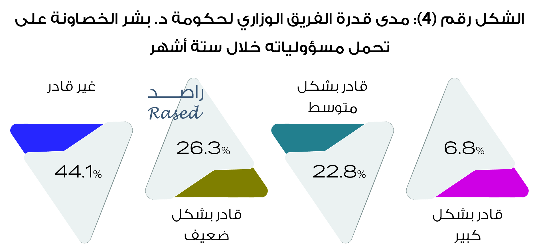 وعرض التقرير نتائج استطلاعاً للرأي حول أداء حكومة الخصاونة خلال ستة أشهر الأولى من تشكيلها وتم تنفيذه خلال الفترة 10/4/2021ولغاية 15/4/2021واستهدف عينة ممثلة شملت 2,140 مواطناً ومواطنة موزعين على كافة المحافظات، حيث أظهرت النتائج أن 6,8% من الأردنيين يرون أن الفريق الوزاري لحكومة الدكتور بشر الخصاونة كان قادراً على تحمل مسؤولياته بشكل كبير، و يرى 22.8% من الأردنيين أن الفريق الوزاري كان قادراً على تحمل مسؤولياته بشكل متوسط، و26,3% من الأردنيين يرون أن الفريق الوزاري كان قادراً على تحمل مسؤولياته بشكل ضعيف، و44,1% من الأردنيين يرون أن الفريق الوزاري لم يكن قادراً على تحمل مسؤولياته.