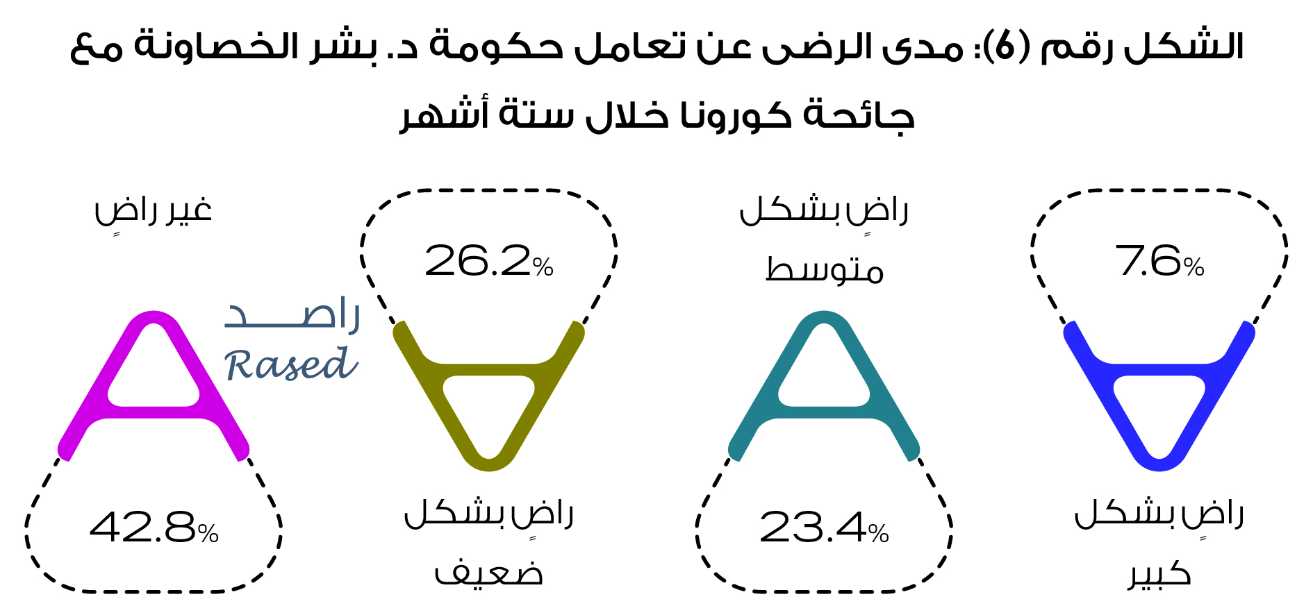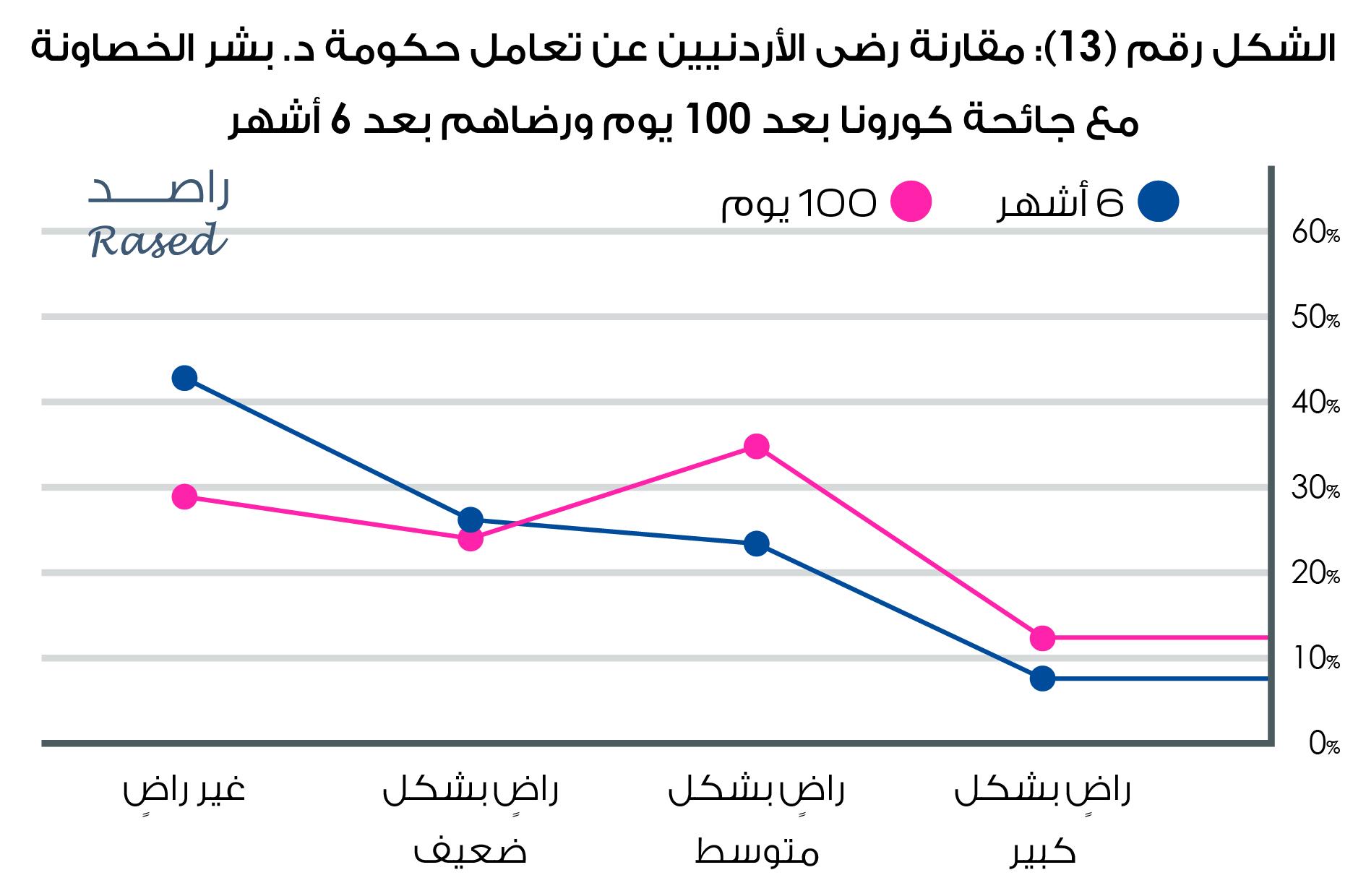 وبينت الدراسة تراجعاً برضا المواطنين عن أداء الحكومة في تعاملها مع جائحة كورونا، حيث كانت 47,1%خلال ال 100يوم الأولى لتصل إلى 31%بعد ستة أشهر، فيما ارتفعت نسبة غير الراضين على تعامل الحكومة مع جائحة كورونا بعد ستة أشهر لتصل الى 42,9%من الأردنيين بينما كان غير الراضين بعد 100يوم على تشكيل الحكومة 28,9%من الأردنيين.