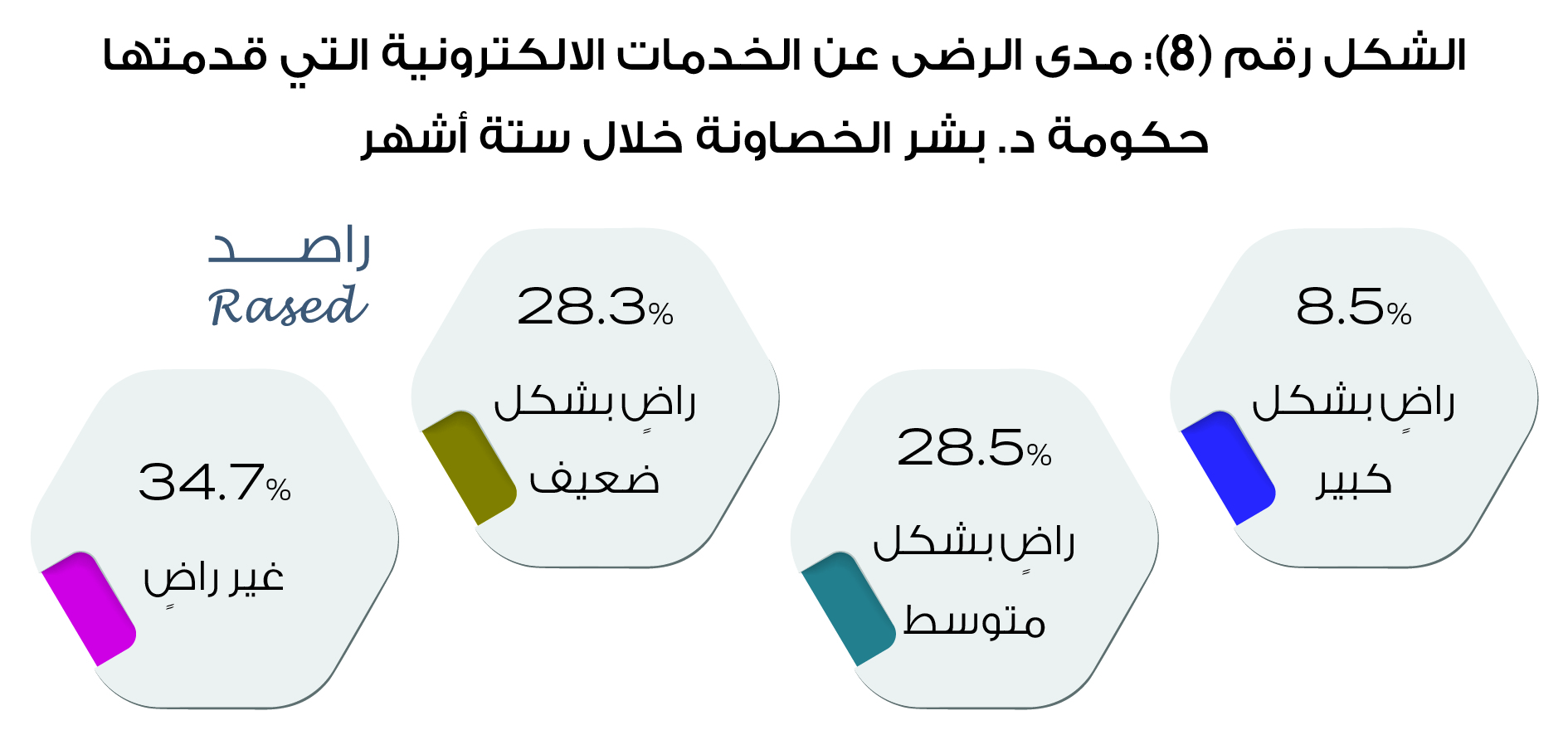 وحول رضى الأردنيين عن مستوى الخدمات الالكترونية المقدمة خلال الـ 6 أشهر الأولى من عمر الحكومة، فقد تبين أن 8,5% من الأردنيين راضون بشكل كبير، و28,5% من الأردنيين راضون بشكل متوسط، بينما كانت نسبة الراضون بشكل ضعيف 28,3% من الأردنيين، وغير الراضون بلغت نسبتهم 34,7% من الأردنيين.