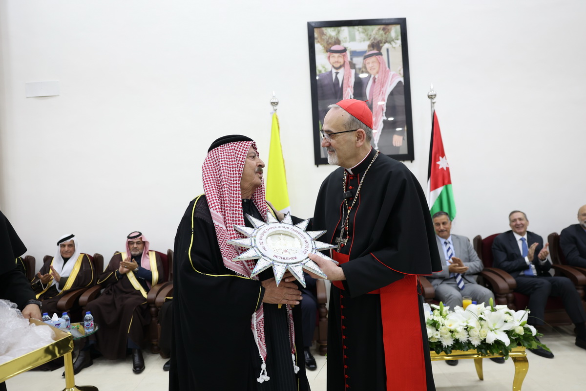 وفي ختام اللقاء، قدّم السيد نعيم زيادات لغبطة البطريرك مسبحةً وردية صُنعت في الأردن، فيما بادل غبطته عشيرة الزيادات، في قاعتهم الجديدة، بهديةٍ رمزية تمثّلت كنجمة الميلاد المصنوعة من الصدف في بيت لحم.