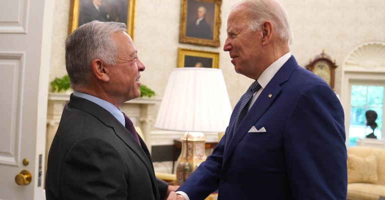 فى لقاء ودي حمل طابع شخصي ومضمون سياسي عميق جمع جلالة الملك والرئيس جو بايدن للمرة الثانية فى البيت الأبيض بحضور الأمير حسين ولي العهد حيث تناول الاجتماع الذى استمر لأكثر من ساعة قضايا سياسية تناولت