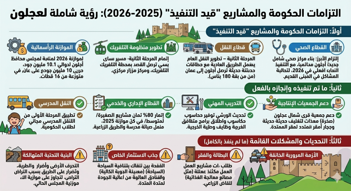 ● الموازنة الرأسمالية: إقرار موازنة مجلس محافظة عجلون لعام 2026 بقيمة تقارب 10.1 مليون دينار (وفق تقديرات المجلس التنفيذي)، موزعة على 16 قطاعاً خدمياً وتنموياً.