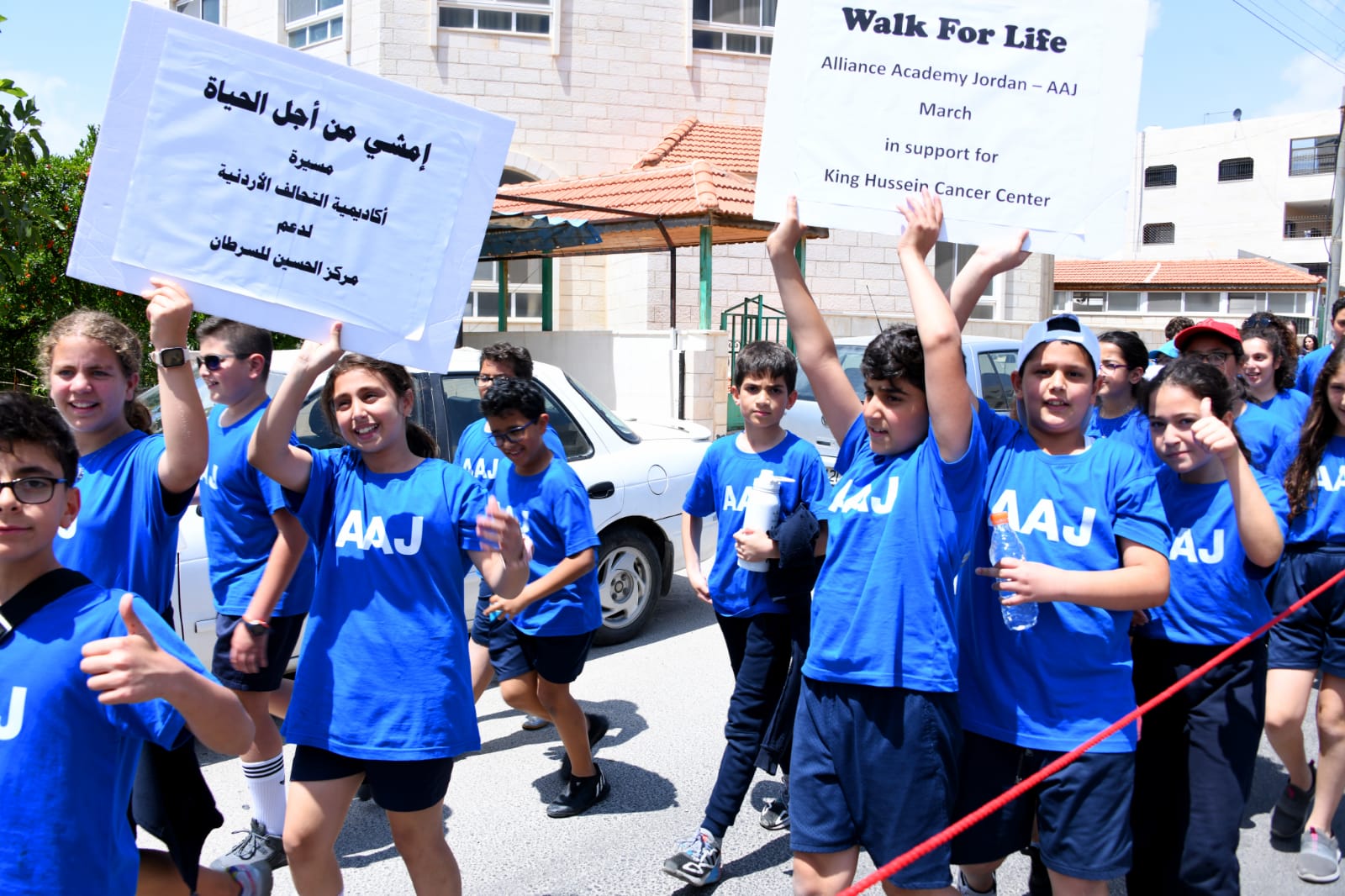 وبعد الانتهاء من المحاضرات التفاعلية شارك الطلاب وكادر المدرسة وأولياء الأمور بمسيرة "أمشي من أجل الحياة" جالت الشوارع القريبة من المدرسة بمرافقة شرطة جنوب عمان ودائرة السير والدفاع المدني لتوفير الحماية خلال المسيرة في شوارع حي اليادودة.
