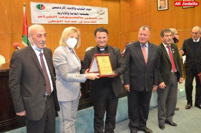 كما تحدث عن مفهوم المواطنة، مؤكداً أن الأردن نشأ على قاعدة عروبية وأنه فتح قلبه وصدره لكل عربي هجره وطنه أو هاجر منه فلم يجد في هذا الوطن الا الحب والدفء. وفي الجلسة الثانية التي ترأسها الدكتور عبدالغني حجير وحملت عنوان "الثقافة الوطنية" وتناولت مستوى الانجاز الثقافي للمؤسسات التي تعنى بالعمل الثقافي ودور القوات المسلحة الأردنية - الجيش العربي بتعزيز الثقافة الوطنية وقيم الولاء والانتماء، وشارك فيها مدير المركز الثقافي الملكي الدكتور سالم الدهام بورقة حملت عنوان "التحديات التي تواجه مسيرة الحياة الثقافية الأردنية" والدكتور بكر خازر المجالي بورقة حملت عنوان "دور الجيش العربي في تعزيز الثقافة الوطنية" ومدير عام المكتبة الوطنية الدكتور نضال العياصرة بورقة حملت عنوان "دور المكتبة الوطنية في المئوية الثانية للدولة" وأمين عام اللجنة الملكية لشؤون القدس الدكتور عبدالله كنعان بورقة حملت عنوان "الوصاية الهاشمية على المقدسات الاسلامية والمسيحية في القدس" صاحبها عرض فيلم عن الوصاية الهاشمية، ومدير المكتبات في أمانة عمان الكبرى ثامر الشوبكي بورقة حول دور أمانة عمان في تعزيز الثقافة الوطنية. وتناولت الجلسة الثالثة التي ترأسها الدكتور حسين الخزاعي وحملت عنوان "التحديات الثقافية..قضايا فكرية في مواجهة المثقف"، البنية التحتية الثقافية والتحديات التي تواجه مسيرة الحياة الثقافية الأردنية وجدلية الإعلام والثقافة والاستراتيجيات الثقافية، وتأثير القضية الفلسطينية على الساحة الثقافية الأردنية، وشارك فيها الدكتور عبد الناصر الحموري بورقة "تعميق البنية التحتية الثقافية" وورقة قدمها القس سامر عازار بعنوان "الأردن نموذج في العيش المشترك والوئام" والدكتور عزمي حجرات بورقة حملت عنوان "الرؤية الملكية" والدكتور محمد ابو هزيم بورقة "الثقافة والفكر والإعلام في مئوية الدولة الأردنية" وكان في الجلسة الافتتاحية سلم رحال، دروعا تكريمية للنجار والروابدة ومجموعة من الداعميين لمسيرة الثقافة والأدب في الأردن. بترا