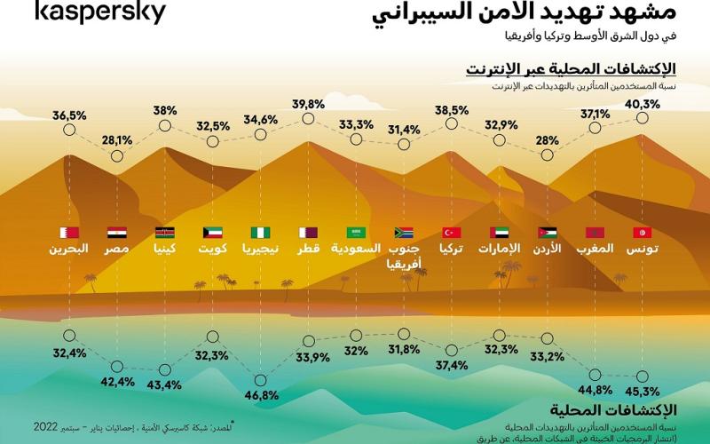 وخلال الحدث، كشف خبراء الشركة عن أحدث أرقام التهديدات الواردة في المنطقة عبر شبكة كاسبرسكي الأمنية Kaspersky Security Network، إذ تأثر حوالي ثلث المستخدمين في منطقة الشرق الأوسط وتركيا وإفريقيا بالتهديدات القادمة عبر الإنترنت وعبر غيرها من نواقل الهجوم الغير المتصلة بالإنترنت ، وذلك بين شهري يناير وسبتمبر من العام الجاري 2022. وفي الشرق الأوسط تحديدًا، كان أكبر عدد من المستخدمين تأثرًا بالتهديدات القادمة عبر الإنترنت في قطر، وذلك بواقع 39.8% من المستخدمين في الدولة، التي تلتها البحرين بنسبة 36.5%، فالمملكة العربية السعودية (33.3%) ودولة الإمارات (32.9%) والكويت (32.5%)، فيما كانت مصر والأردن الأقلّ تأثرًا بالتهديدات، بواقع 28.1% و28% على التوالي.