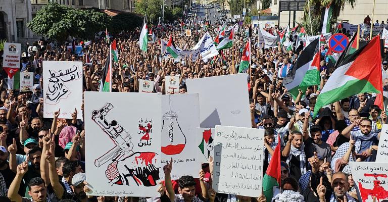 انطلقت مسيرة حاشدة من أمام المسجد الكالوتي في العاصمة عمّان، دعما وانتصارا للمقاومة الفلسطينية في قطاع غزة، في ظل هجمات عنيفة وإجرامية ضد الشعب الفلسطيني الأعزل، الذي يواجه آلة القتل الدموية، وسط صمت