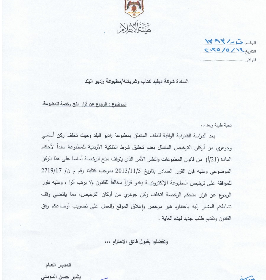 The decision made without giving us a chance to rectify it is based on a technicality which we disagree with. Our news site is listed as the online organ of our radio station Radio Al Balad that has been properly licenses since 2005. Jordanian law allows non-Jordanians to own radio stations while news sites must be owned 100% by Jordanian citizens. Radio al Balad is owned by 50% a Jordanian citizen.