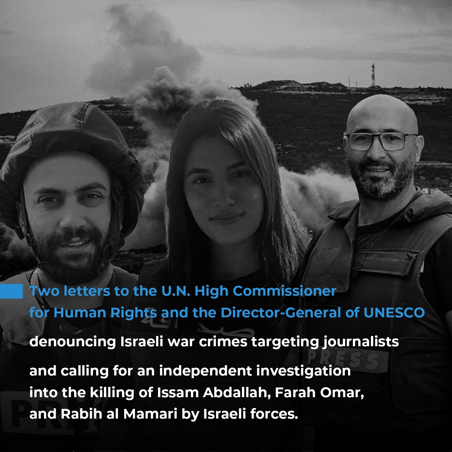 In the letter addressed to the Director-General of UNESCO, Audrey Azoulay, the signatories asked, based on her responsibility to enhance the safety of journalists and combat impunity for those who target them, to take the following actions: (1) advocate for accountability for the apparent war crimes committed by Israel in south Lebanon against seven journalists on October 13, 2023 and against two journalists on November 21, 2023, (2) publicly and privately support our call for an OHCHR investigation, and (3) include the cases of Mr. Issam Abdallah, Mrs. Farah Omar and Mr. Rabih Al-Maamari in the UNESCO Observatory of Killed Journalists.