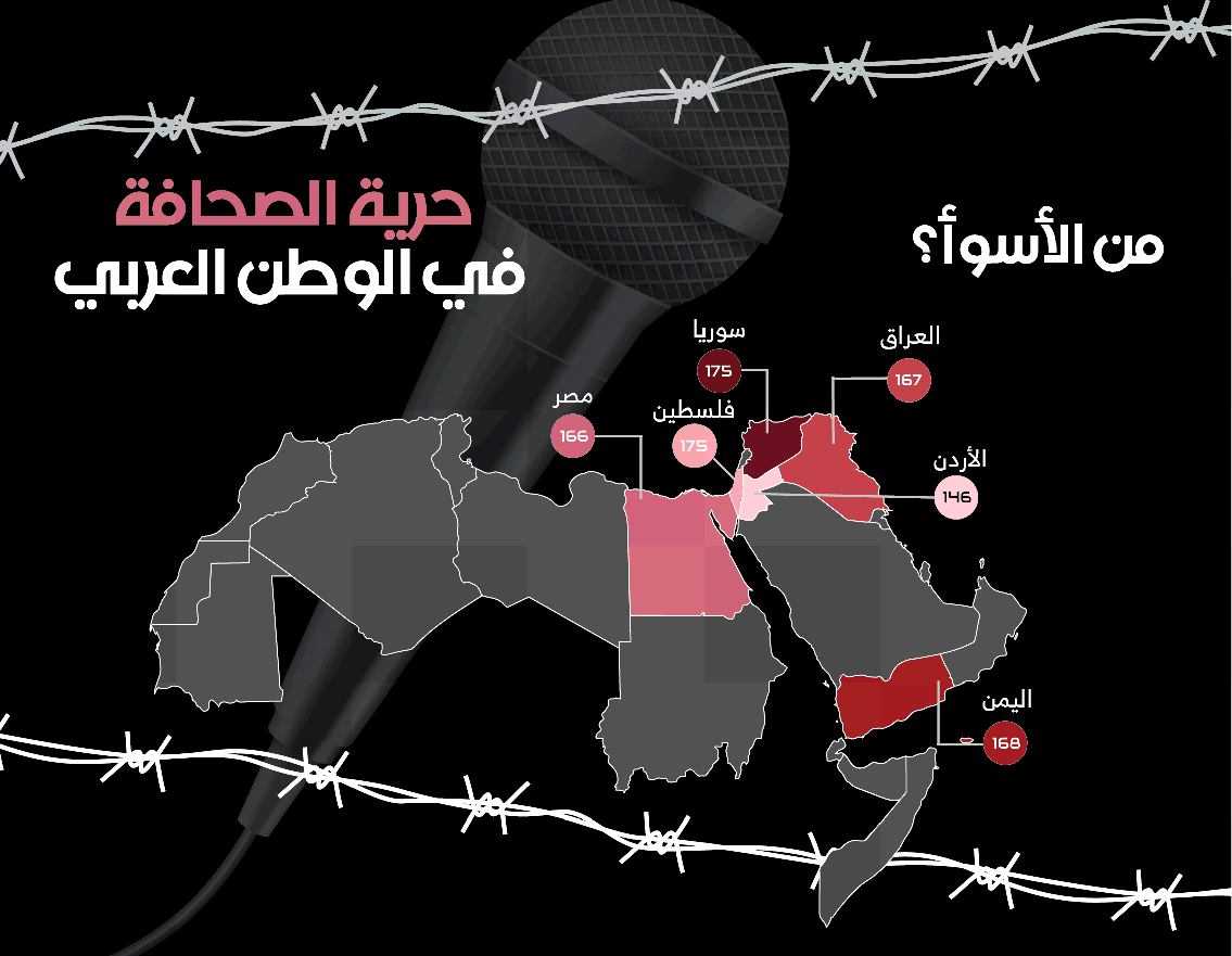 Syria ranked 175th, Yemen 168th, and Iraq 167th—countries where a high number of journalists are either missing or being held hostage. While Palestine advanced 14 places to rank 156th, the security situation for journalists remains dire. In 2022 alone, several journalists were killed by Israeli forces, and targeted assassinations continued during the most recent war on Gaza. Egypt ranked 166th out of 180 countries, while Jordan came in at 146th on the same index.