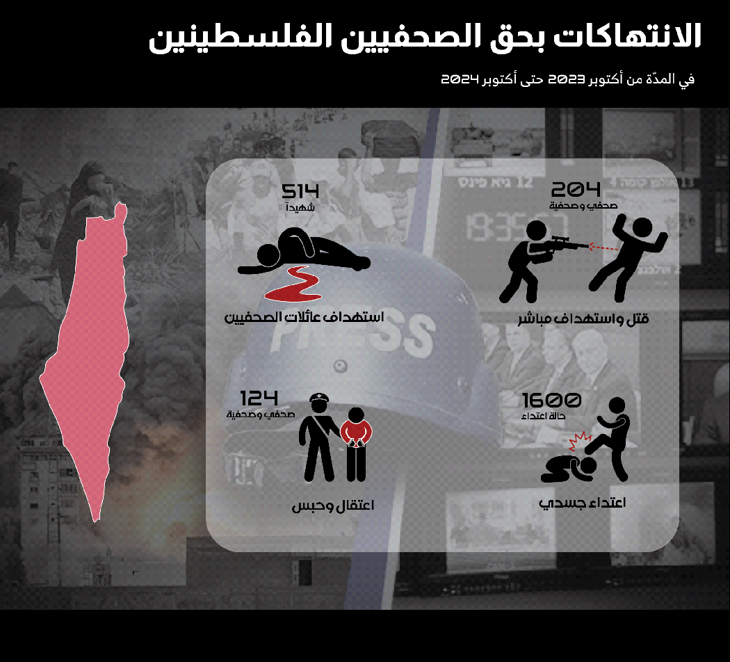 Recent figures from the Palestinian Journalists Syndicate—documenting violations from October 2023 to October 2024—reveal that over 1,600 crimes and attacks were committed against Palestinian journalists. This includes the arrest of 124 journalists (male and female) and the killing of 514 family members of journalists.