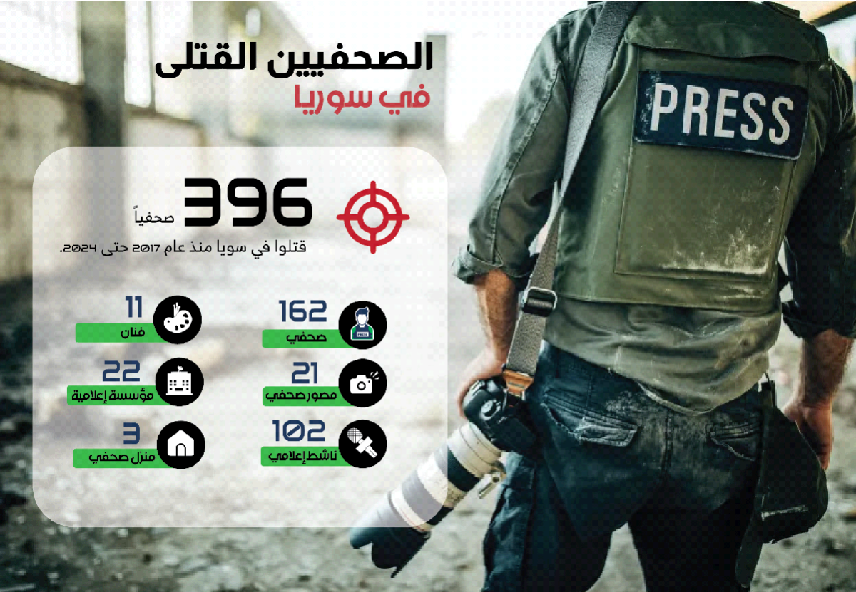In Syria, the reality for journalists goes beyond restrictions—it is one of the most dangerous environments for media professionals. The Skeyes Center for Media and Cultural Freedom documented the killing of 396 journalists between 2017 and 2024. The tally includes 162 journalists, 21 photographers, 11 artists, 102 media activists, in addition to the targeting of three journalists’ homes and 22 media institutions.