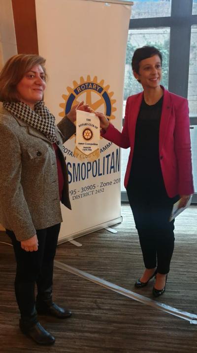 At the end of the lecture, the Rotary president Ghada Fanek presented the EU ambassador with the Cosmopolitan club’s flag.