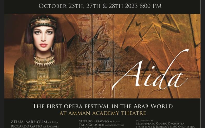 The biggest show yet! Amman Opera Festival for its 5th anniversary presents the world famous opera, Aida at Amman Academy theatre starring Zeina Barhoum as Aida from Jordan, Riccardo Gatto as Radames, Federico De Antoni as the King of Egypt from Italy, Cristina del Barrio as Amneris from Spain, in the cast Opera trained Jordanian Sopranos Talia Ghosheh and Sara Barakat and Jordanian tenors Graziano Issa, Abdallah Kayyali and Raja Outaqui and many other international artists. Accompanied by The International Opera Aida Choir and Monferrato Classic Orchestra conducted by Claudio Morbo and directed by Fabio Bounocore.