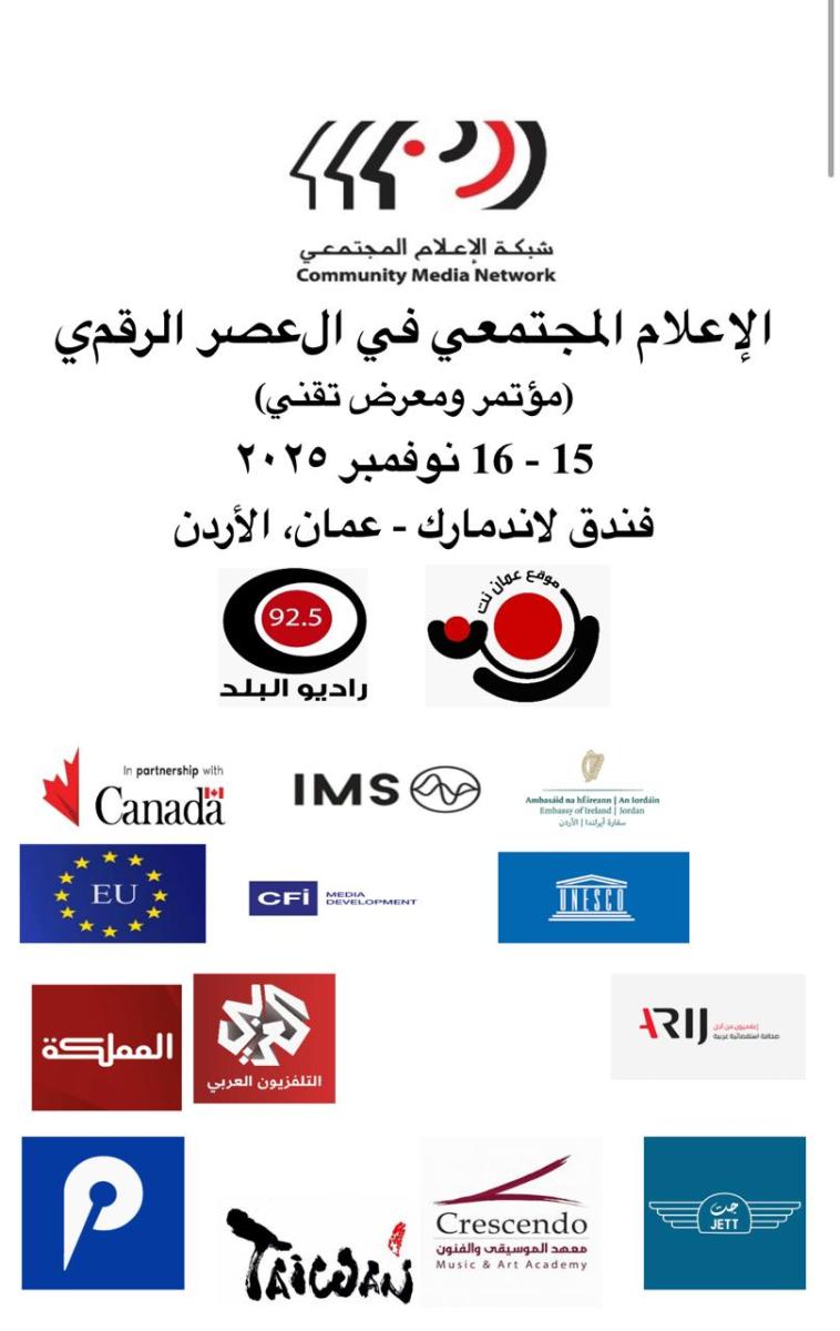 The Community Media in the Digital Age Conference, organized by the Community Media Network (CMN), will kick off on Saturday, November 15, 2025, in Amman, Jordan, celebrating 25 years since the establishment of AmmanNet, the first online and community radio station in the Arab world.