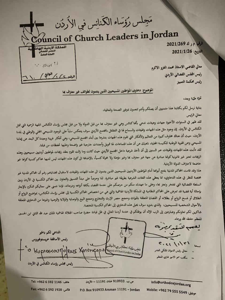The January 26th 2021 letter, sent to Judge Mohammad Al Ghazo head of the Judicial council, is titled “law suits by Christians belonging to unrecognized churches.” In the letter the Orthodox archbishop says: “there are great dangers from the teachings and ideas that are disseminated by these groups that are being spread within the Christian society. These are strange ideas that depart from our Christian faith and the national identity of the local church. In addition, these groups are funded from abroad and have outside and unclear agendas and we have reservations about them.”