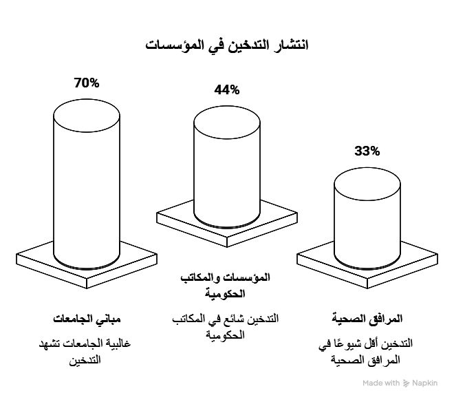The problem is exacerbated within government and educational institutions, which are supposed to set an example in enforcing the law. Appalling violations have been observed, with smoking seen in 70% of university buildings, 44% of government institutions and offices, and even 33% of health facilities themselves.