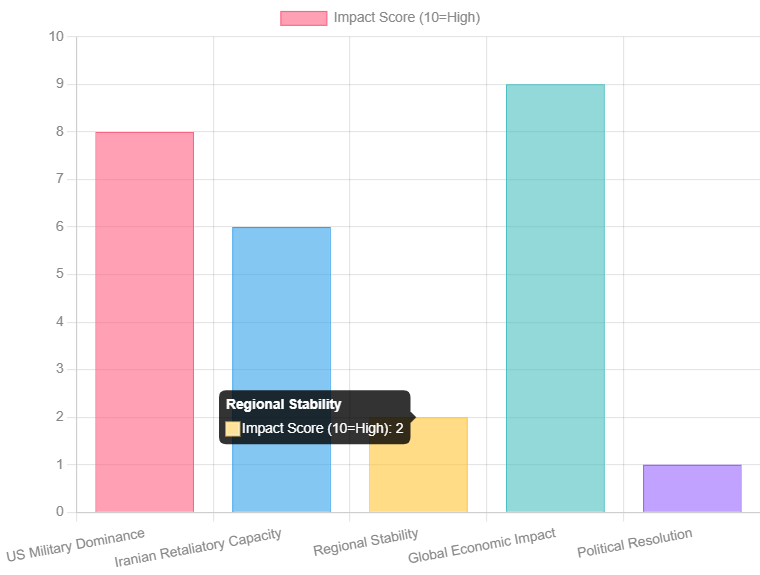 This bar chart illustrates the perceived impact of the initial 11 days across various dimensions. While U.S. military dominance is high, Iranian retaliatory capacity is still significant. Regional stability has severely declined, and the global economic impact is substantial, while prospects for a political resolution remain low.