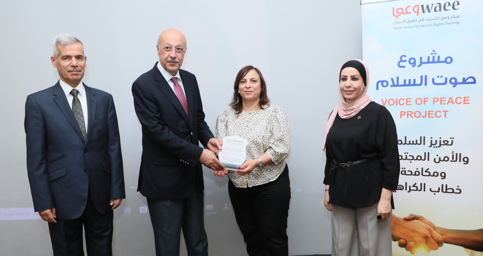 تحت رعاية الامين العام لوزارة الاتصال الحكومي مندوباً عنه الاستاذ طه الخصاونه مدير الإعلام الرقمي وإنتاج المحتوى، عقد مركز وعي للتدريب في حقوق الانسان الحفل الختامي لمشروع " صوت السلام" بدعم من مركز الملك عبد الله بن عبد العزيز العالمي للحوار بين أتباع الأديان والثقافات (كايسيد)،